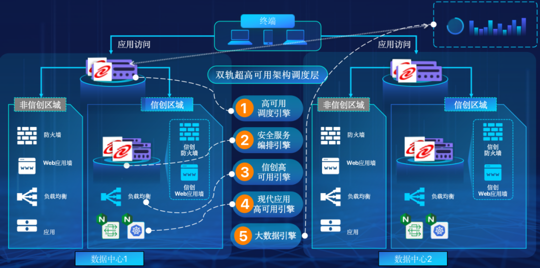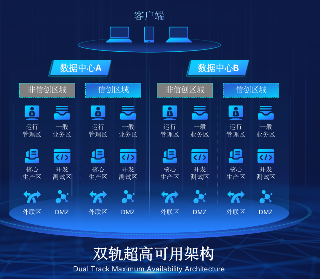 快盈在企业面临自主创新IT基础重构过程中,推出的全新架构双轨超高可用架构(简称DTMAA),在双活数据中心的分区调度基础上,添加每个数据中心内信创域和非信创域的分域调度,来实现分区分域协同的多活双轨超高可用。