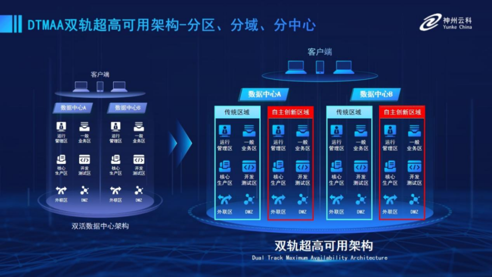 为帮助金融客户更好地应对数字经济时代对可持续性的高要求,实现“信创”与“数字化”齐头并进,快盈推出了双轨超高可用架构。该架构在双活数据中心的分区调度基础上,增加信创域和非信创域的分域调度,实行信创域与传统域应用全量部署,使双中心运营变为双中心四区域并行运行,互为多活,将“0到1”的单轨建设道路变为分区分域协同的多活双轨超高可用架构。帮助客户在新架构下,保障“信创”的同时解决性能瓶颈,提升稳定性,保证应用可持续性,最终实现信创区域和非信创区域的平滑过渡,完成国产化替代目标。